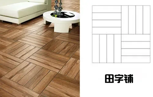 田字拼,又称为复古拼或正方形拼,从视觉上看和旧时候人们编制的花篮有些像。比较适合方方正正的地面,而且趣味性也较强,让人眼前一亮。田字拼整体呈方形,无需切斜面,因此相对而言损耗也较小。