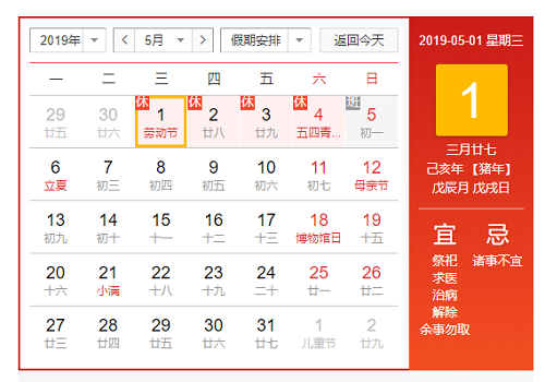 一、2019年5月1日至4日放假调休,共4天。4月28日(星期日)、5月5日(星期日)上班。