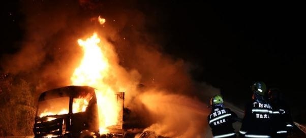 4月20日4时39分,G80广昆高速百色至南宁段(百色东收费站往南宁方向高速路8公里处)一行驶中的货车着火,情况紧急,百色市消防支队特勤中队接警后立即出动4辆消防车16名指战员赶赴现场扑救,经过5小时的奋战终于成功扑救。