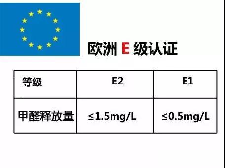 E级认证起源于德国,以下是欧洲甲醛释放限量等级的环保标准。欧洲E级认证分为E1、E2两级。