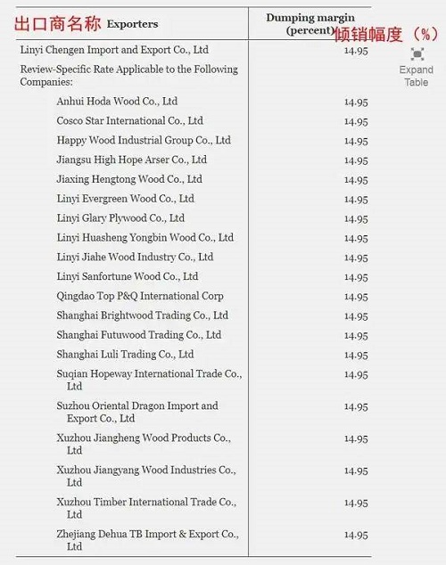经美国商务部复查,对包括强制应诉企业临沂承恩商贸有限公司(Linyi Chengen Import and Export Co., Ltd)在内的21家硬木胶合板出口商,采用14.95%的单独税率。而中国的其他硬木胶合板出口商,由于没有及时递交采用单独税率的申请或证明材料,所以其缴纳反倾销税的税率仍然维持原来的183.36%。采用单独税率的21家硬木胶合板企业名单如下: