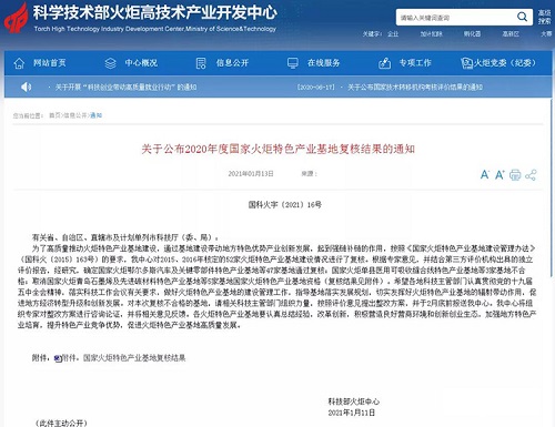 1月14日,科技部下达《关于公布2020年度国家火炬特色产业基地复核结果的通知》,国家火炬临沂费县木基复合材料特色产业基地经过专家评审、第三方机构独立评价,顺利通过国家火炬特色产业基地复核。