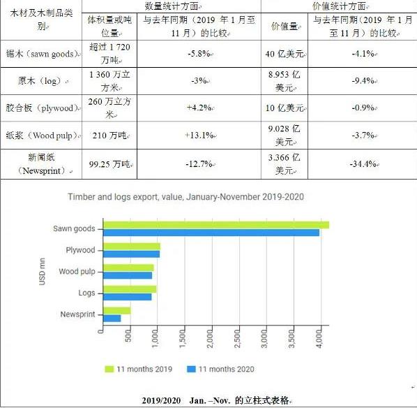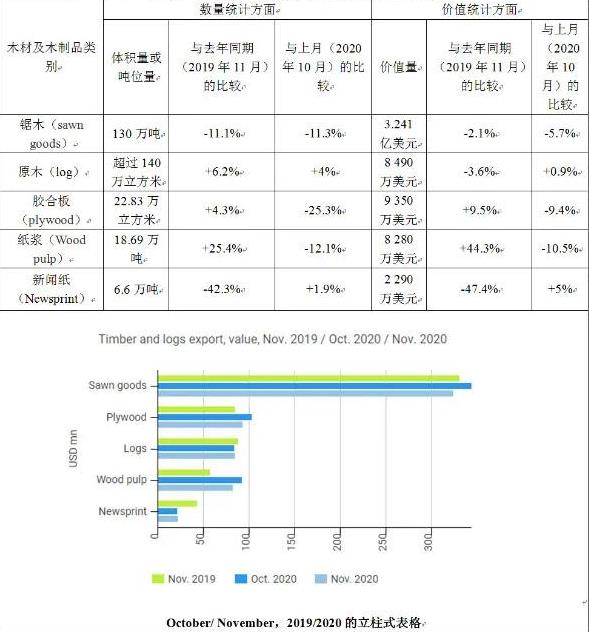 根据俄罗斯海运业咨询媒体SeaNews 2021年1月22日公布了俄罗斯联邦海关局**统计的本国2020年1月至11月的木材出口数据(RF Federal Customs Service’s statistics),情况如下表所示。