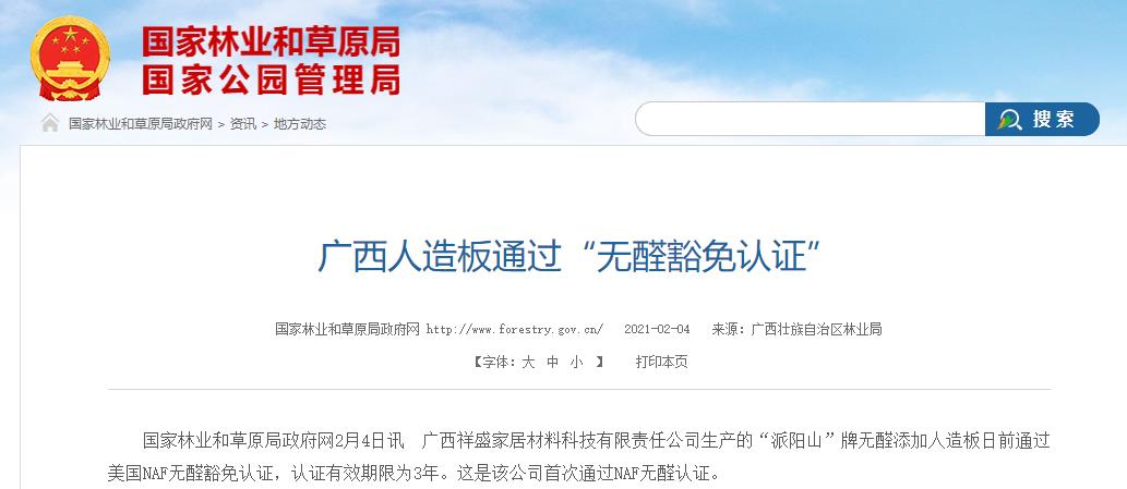 广西祥盛家居材料科技有限责任公司生产的“派阳山”牌无醛添加人造板日前通过美国NAF无醛豁免认证,认证有效期限为3年。这是该公司首 次通过NAF无醛认证。