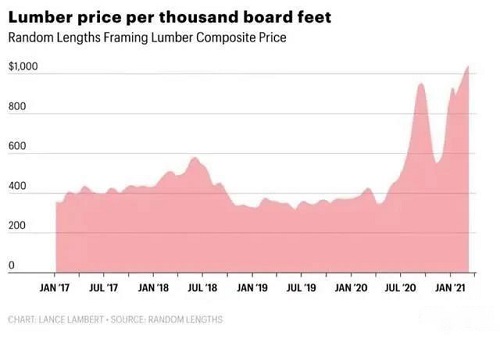 据美国《财富》杂志网站20日报道,由疫情引发的木材短缺情况并未结束。根据全球木材产业调研机构Random Lengths的数据,自新冠肺炎疫情暴发以来,全球木材价格上升了188%。截至今年3月11日当周,每千板英尺(北美木材计量单位)的木材价格为1044美元(相当于每立方米442美元、约合人民币2876元),创历史最 高水平。