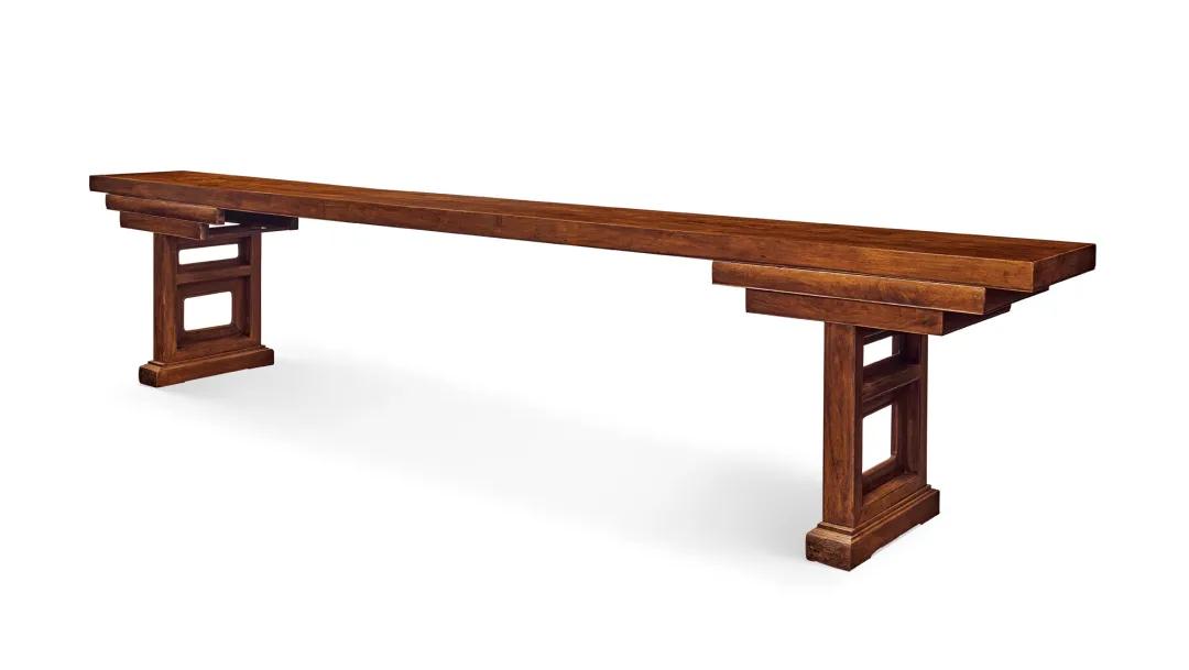 目前所知,长度达4公尺以上的黄花梨案寥若星辰,达4.5公尺以上者则仅存二例,另一例架几案存故宫博物院,为清宫旧藏,长457公分,宽49.2公分,通高78公分,面厚8.3公分,然无论体量还是气势,均略逊于此供案。